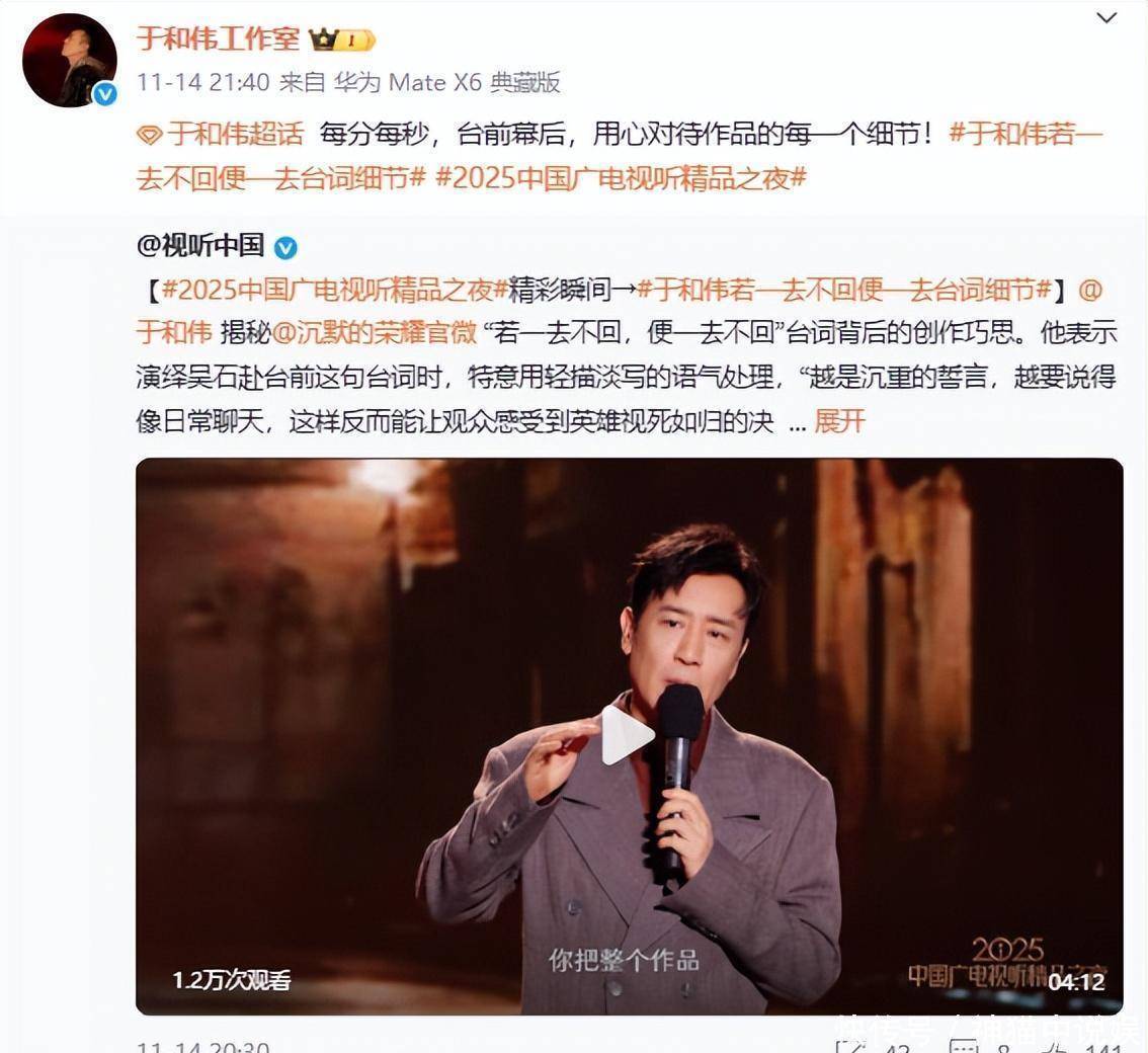 评论区网友也都在说于老师真帅,笑起来超好看,让人眼前一亮的永远是你。后面又发了于老师上台讲话的视频,他向大家解读了电视剧《沉默的荣耀》其中的一句台词。